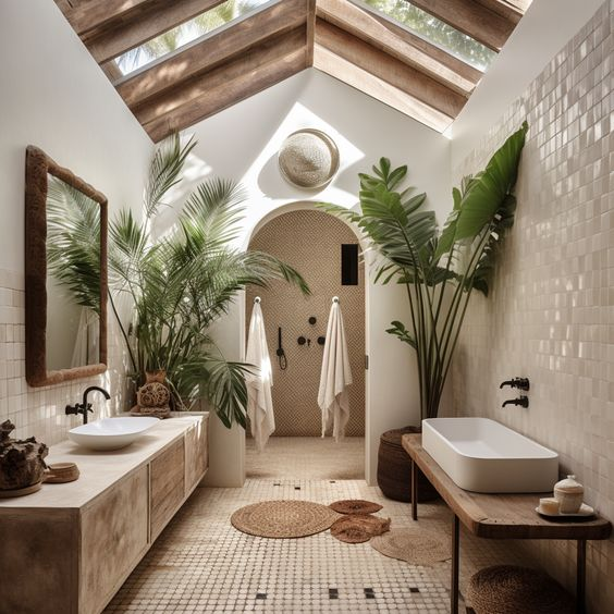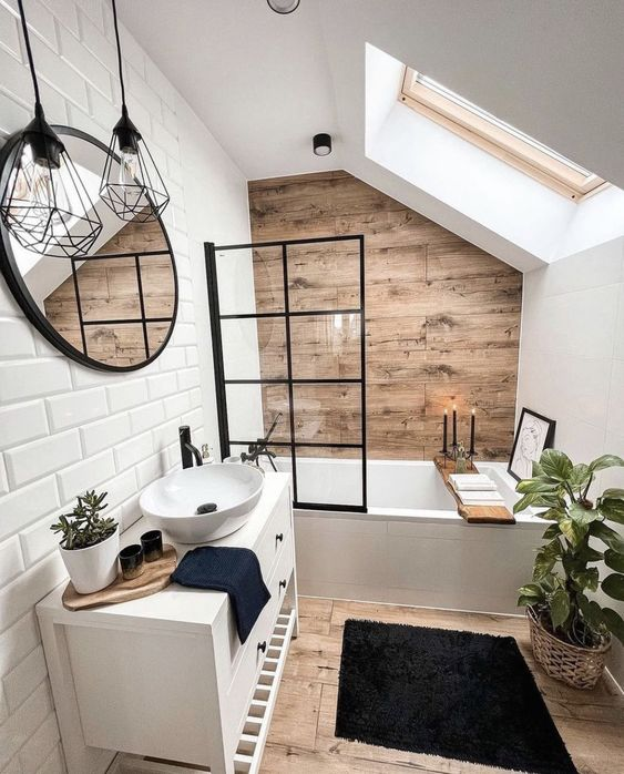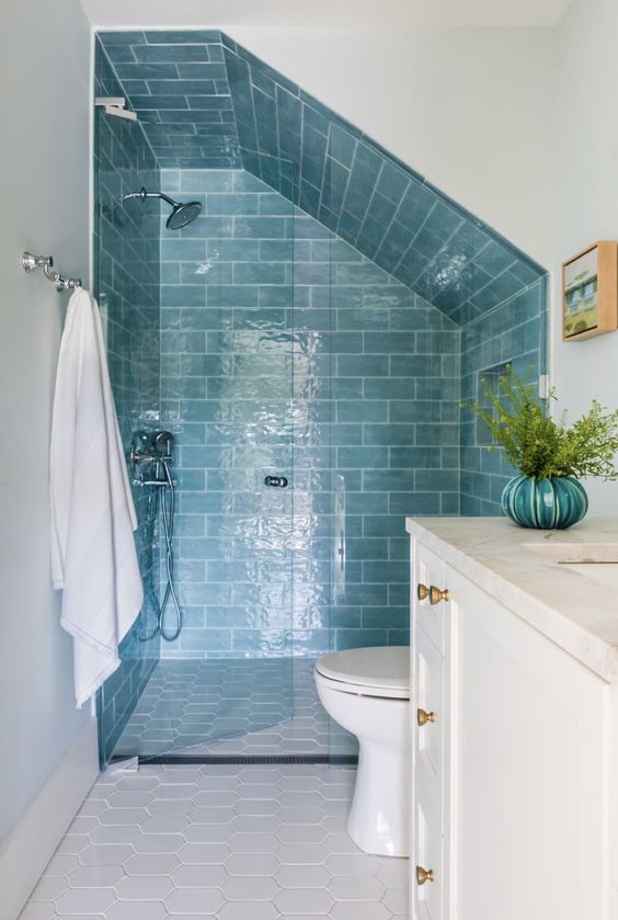 Tavanul înclinat de la mansardă restrânge spațiul băii și o poate face puțin mai dificil de aranjat. Dar, acest lucru o scoate în evidență și se poate profita de lumina naturală care intră pe geamul de pe acoperiș. Lângă acesta se poate așeza chiuveta cu oglindă sau, dacă peretele este destul de lat, chiar o cadă.