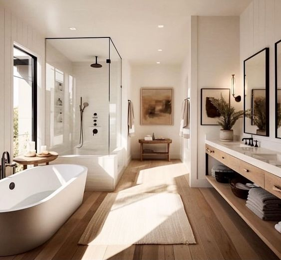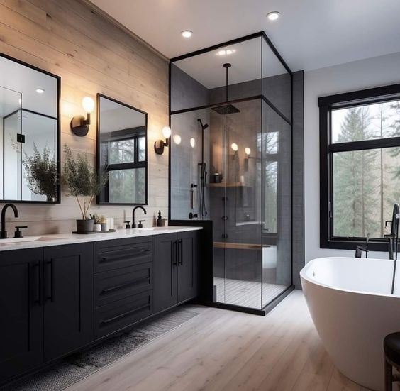 Stilul eclectic este o îmbinare între cele clasic și modern. O baie amenajată astfel va avea culori contrastante, mobilier cu linii drepte și simple. Lemnul, în toată această combinație va da perfect. Folosește-l pe podea sau pe un perete accent.