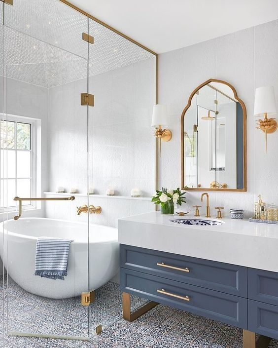 O cadă este perfectă într-o baie mare, mai ales una free standing. Te poți juca cu diferite culori în alegerea gresiei și a faianței, precum și cu formele acestora. În funcție de forma băii poți amenaja aici spații de depozitare, unde să așezi prosoapele, de exemplu. O plantă mare într-un colț va da o notă specială băii tale, la fel și aplicele care vor lumina ambele chiuvete.