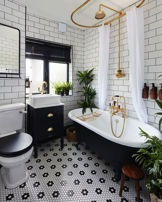 Stilul retro înseamnă culoare, obiecte masive și metal. Combină obiecte sanitare mari cu faianță colorată și vopsește pereții într-o altă nuanță puternică. Atârnă pe pereți plante curgătoare și pune la cadă o perdea de duș.