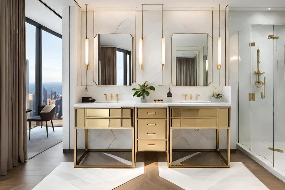 Luxul e dat de lumină, strălucire, materiale de calitate, culori metalizate, oglinzi încadrate. Pune într-o astfel de baie o podea cu un design special, o faianță simplă și o cadă free standing, iar rezultatul va fi spectaculos.