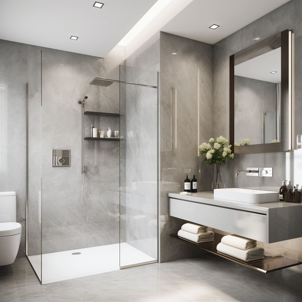În cazul unui spațiu dreptunghiular, dar care să fie destul de mare, posibilitățile de amenajare sunt multe. Dacă nu îți dorești o cadă, atunci un duș imens este alegerea perfectă. Pentru acesta folosește faianță și gresie diferite ca model de restul încăperii, dar în aceeași culoare. Sau poți amenaja acest spațiu cu culori în contrast cu restul băii. O altă idee care va scoate baia din anonimat este să folosești chit într-o culoare opusă gresiei și faianței.