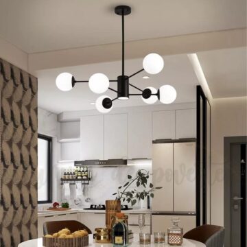 Chiar dacă vorbim despre alb și nuanțe extrem de deschise, care dau senzația de lumină și spațiu, nu înseamnă că iluminatul trebuie neglijat. Dimpotrivă, este un element care pe lângă faptul că e necesar, e parte din design.