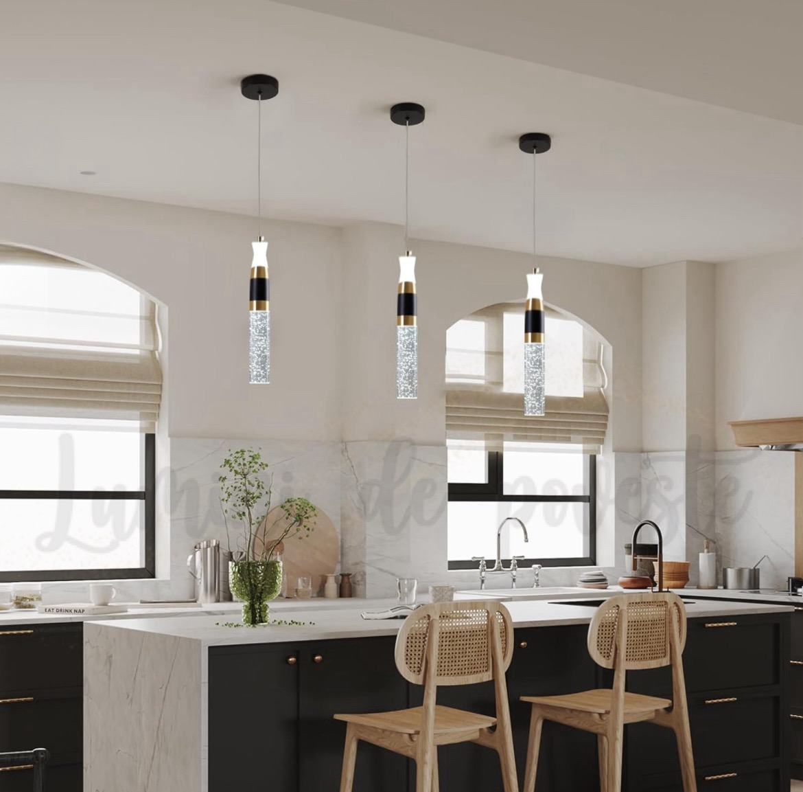 Un element care va da foarte bine sunt corpurile de iluminat de deasupra barului. Acestea vor folosi și la delimitarea zonelor, dar alese bine pot fi un element de decor atrăgător.