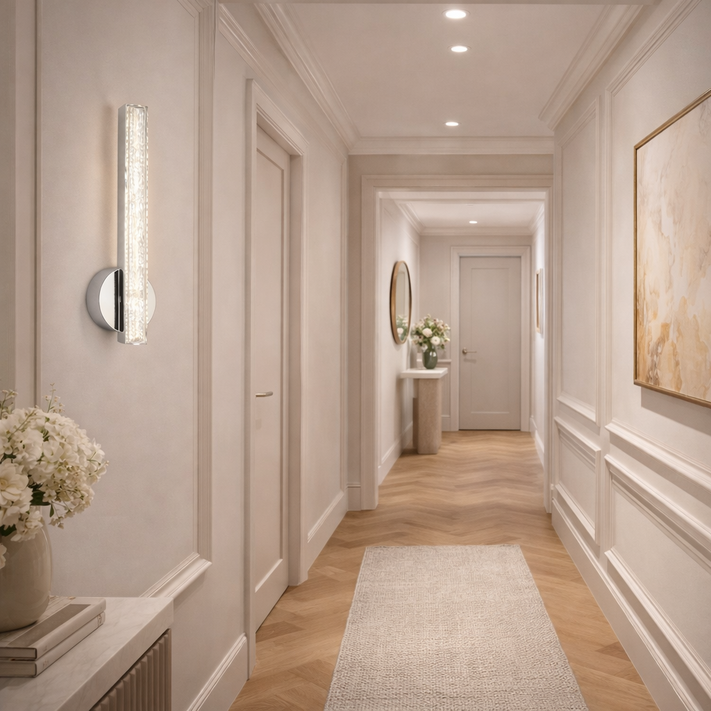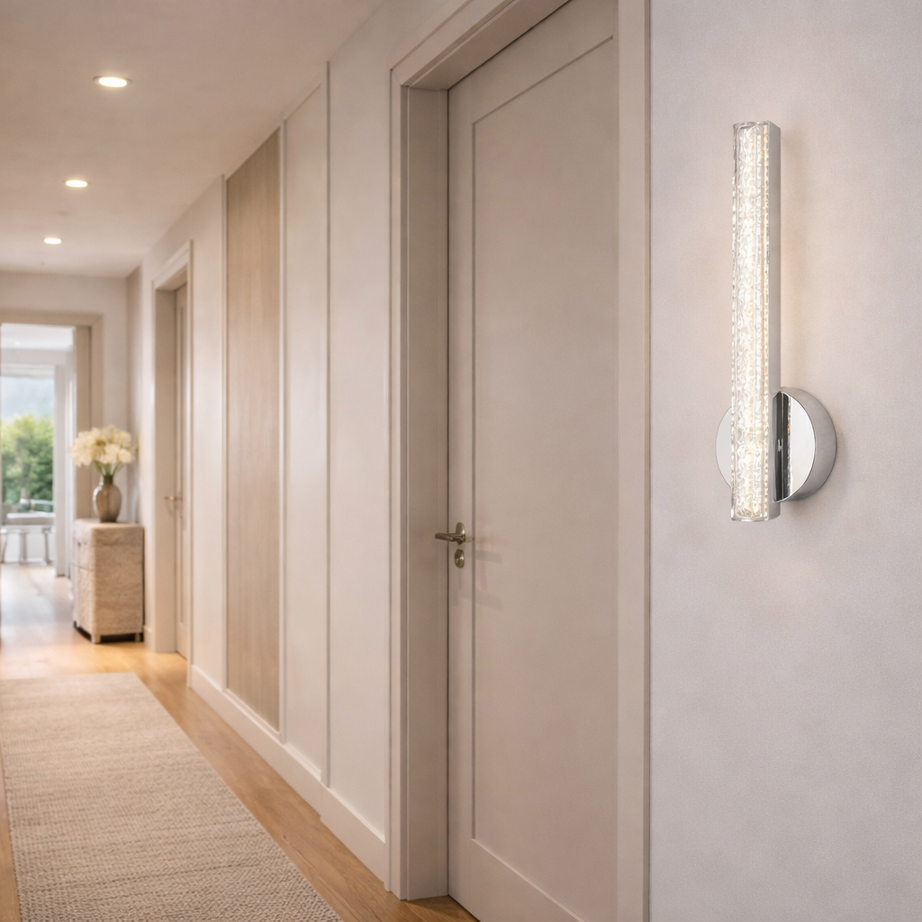 Fabricata din materiale de calitate superioara, precum acril si metal, aceasta aplica nu doar ca este durabila, dar si usor de intretinut. Culoarea argintie adauga un strop de rafinament, facand-o o alegere excelenta pentru orice spatiu. Cu o inaltime de doar 6 cm, aplica LED Cristal Vertical Slim poate fi montata in spatii reduse, fara a compromite stilul sau functionalitatea.