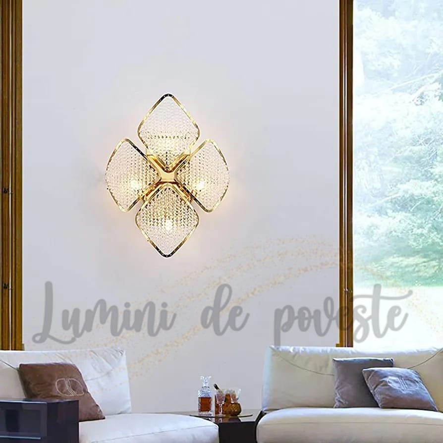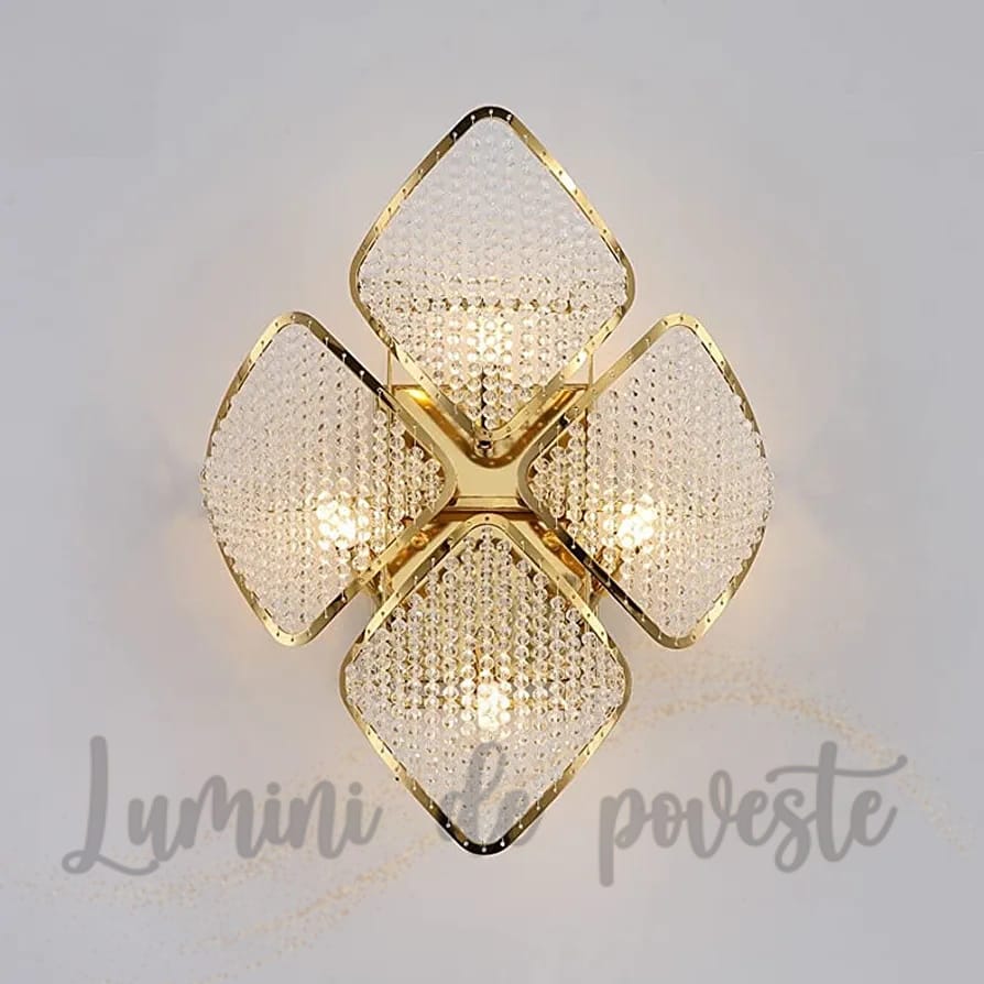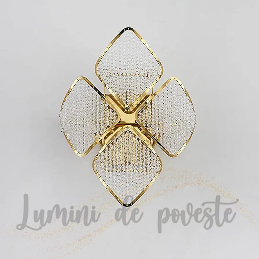 Aplica Summer Gold reprezinta alegerea ideala pentru cei care doresc sa aduca un plus de eleganta si rafinament spatiului interior. Aceasta aplica impresioneaza prin designul sau sofisticat, realizat din cristal K9 de inalta calitate si metal rezistent, oferind un aspect luxos si modern in acelasi timp. Cu o culoare aurie distincta, Aplica Summer Gold devine rapid punctul de atractie al oricarei incaperi, fie ca este vorba despre living, dormitor sau hol.