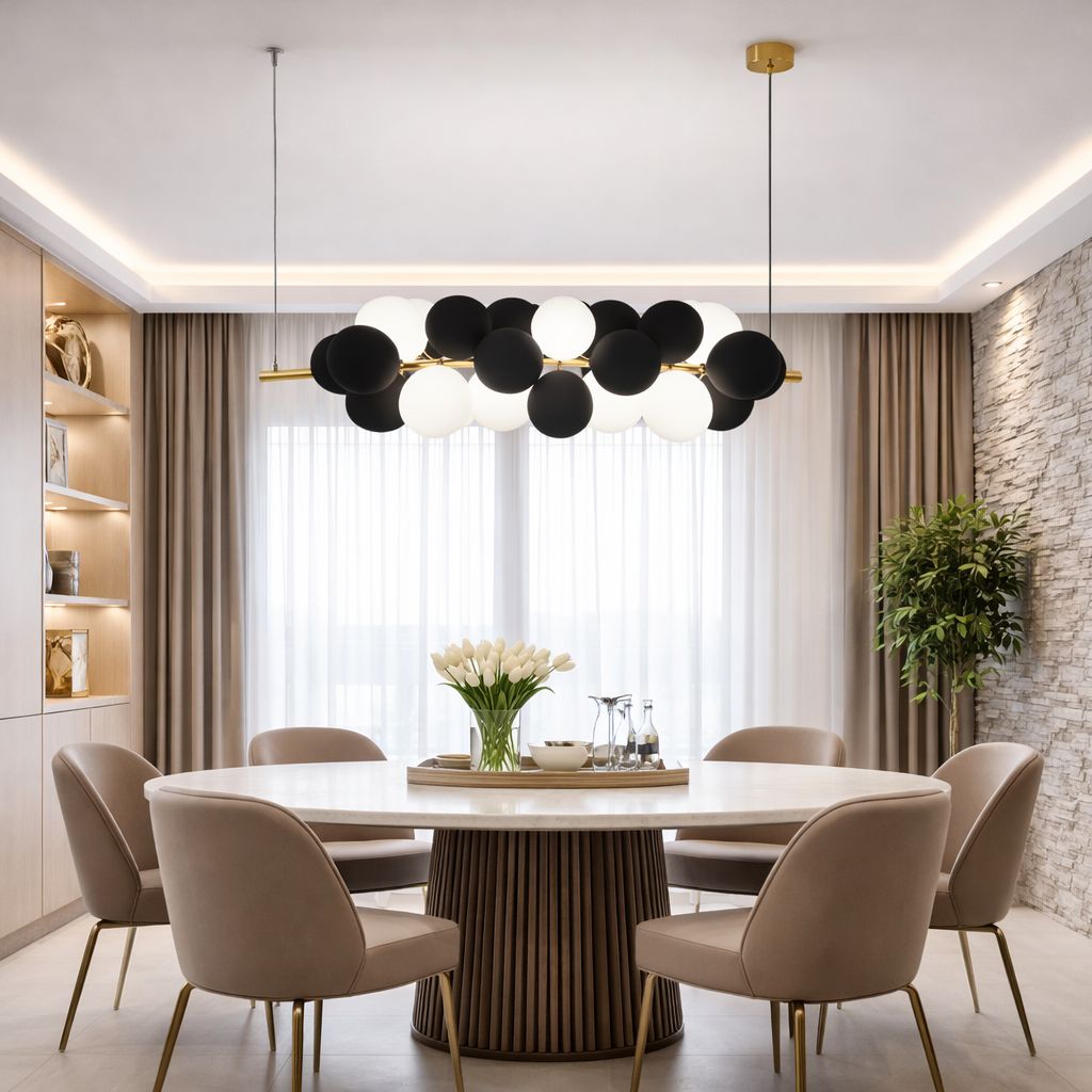 Candelabru Bloom Mixed Dining este alegerea ideala pentru a aduce un plus de rafinament si modernitate oricarei incaperi in care este amplasat. Proiectat cu un design contemporan si elegant, acest candelabru se remarca prin combinatia armonioasa de culori alb, auriu si negru, detalii care ii confera un aspect sofisticat si versatil, potrivit atat pentru sali de dining, cat si pentru livinguri sau birouri stilate. Candelabru Bloom Mixed Dining dispune de sase surse de iluminare cu soclu G9, oferind un nivel optim de luminozitate, iar dimensiunile sale, cu o latime de 24 cm si o lungime de 80 cm, il fac usor de integrat in spatii variate, fie ca este vorba despre incaperi mai mari sau mai restranse. Realizat din materiale de inalta calitate precum acril si metal, acest corp de iluminat este durabil si rezistent, asigurandu-se ca investitia dumneavoastra va fi de lunga durata. Candelabrul nu include becuri, oferindu-va libertatea de a alege tipul de iluminare care se potriveste cel mai bine preferintelor personale si atmosferei dorite. Cu un sistem clasic de intrerupator si un numar de faze de unu, instalarea si utilizarea sunt intuitive si accesibile. Candelabru Bloom Mixed Dining vine insotit de o garantie de doi ani si este certificat CE si Ro Hs, garantand respectarea standardelor europene de siguranta si calitate. Acest model nu este doar un simplu obiect de iluminat, ci si un veritabil element decorativ, ce poate deveni piesa centrala a oricarei incaperi. Alegeti Candelabru Bloom Mixed Dining pentru a transforma spatiul dumneavoastra intr-un ambient primitor, luminos si elegant, unde fiecare detaliu conteaza.