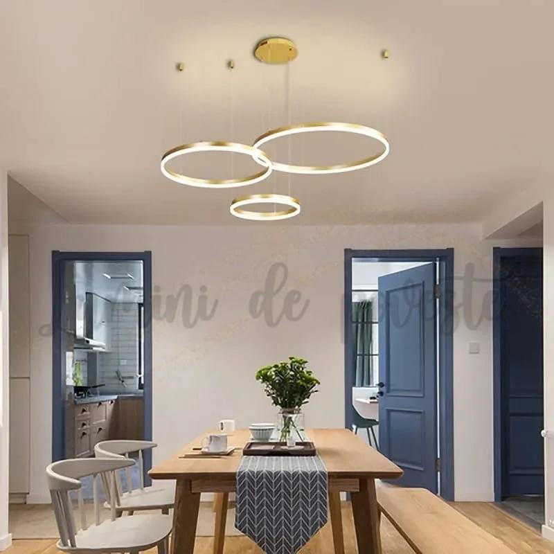 Produsul dispune de trei surse de iluminare dispuse pe cercuri cu diametre de 30 cm, 40 cm si 60 cm, oferind o distributie optima a luminii. Soclul LED este integrat, ceea ce garanteaza consum redus de energie si o durata de viata extinsa a sursei de lumina. In plus, puteti selecta temperatura culorii luminii intre cald, natural sau rece, adaptandu-se astfel oricarui moment al zilei sau activitati. Candelabru LED 148 W Minimalist Gold 30+40+60, Telecomanda poate fi controlat atat printr-un intrerupator clasic, cat si prin telecomanda, sporind astfel confortul utilizatorului.