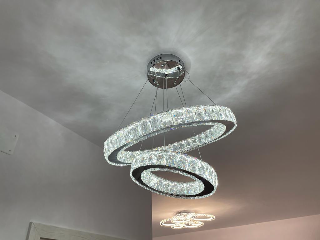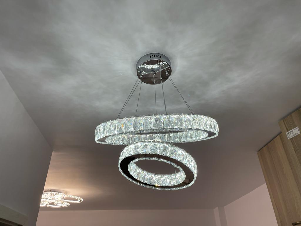 Candelabrul LED 128 W Creative Cristale 2 Cercuri, Telecomanda, reprezinta alegerea ideala pentru cei care isi doresc un corp de iluminat modern, elegant si functional. Acest candelabru LED impresioneaza prin designul sau inovator, avand doua cercuri concentrice realizate din cristal K9 de inalta calitate si metal finisat in nuante argintii si cromate, detalii care confera spatiului o nota distincta de rafinament si lux.