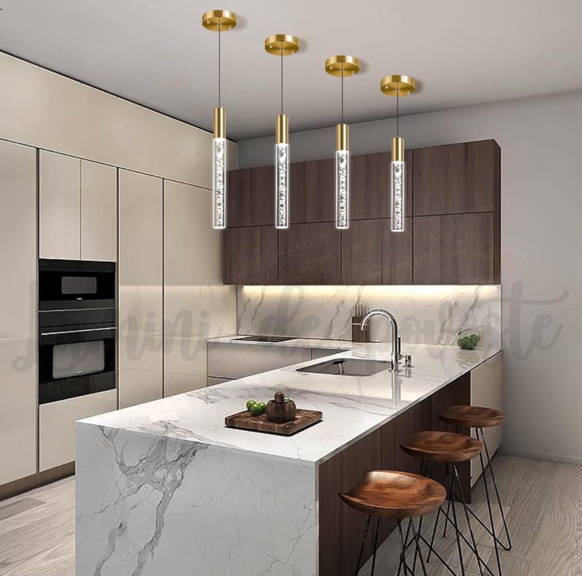 Pentru acest tip de bucătărie, cel mai bine se potrivește o lampă pe lungimea spațiului.