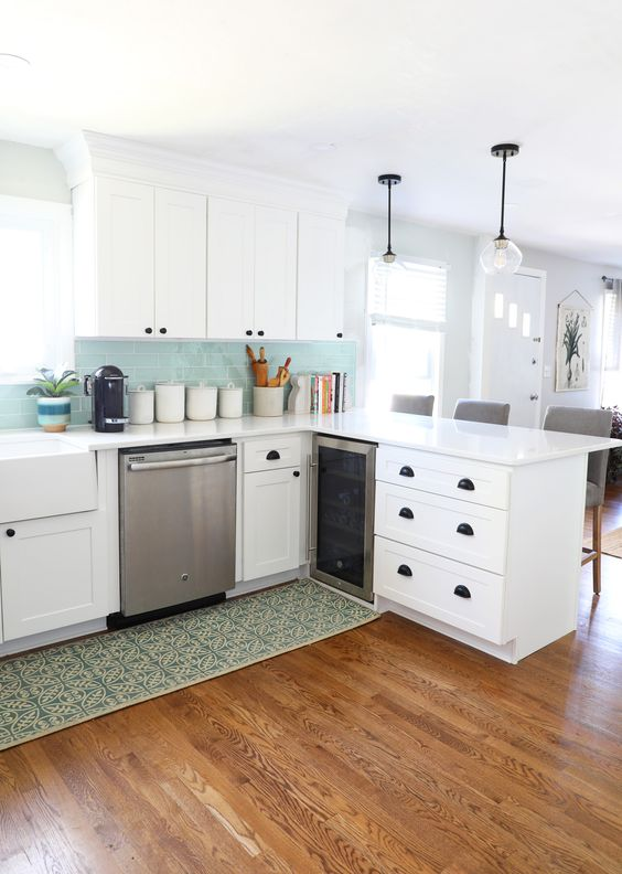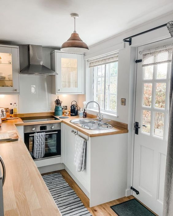 Mobilierul în formă de L poate fi de ajutor. Găsește un tâmplar priceput care să își customizeze mobilierul și gândiți împreună cea mai bună compartimentare. Ține cont de locul unde trebuie amplasate chiuveta și aragazul, iar frigiderului găsește-i un loc potrivit.