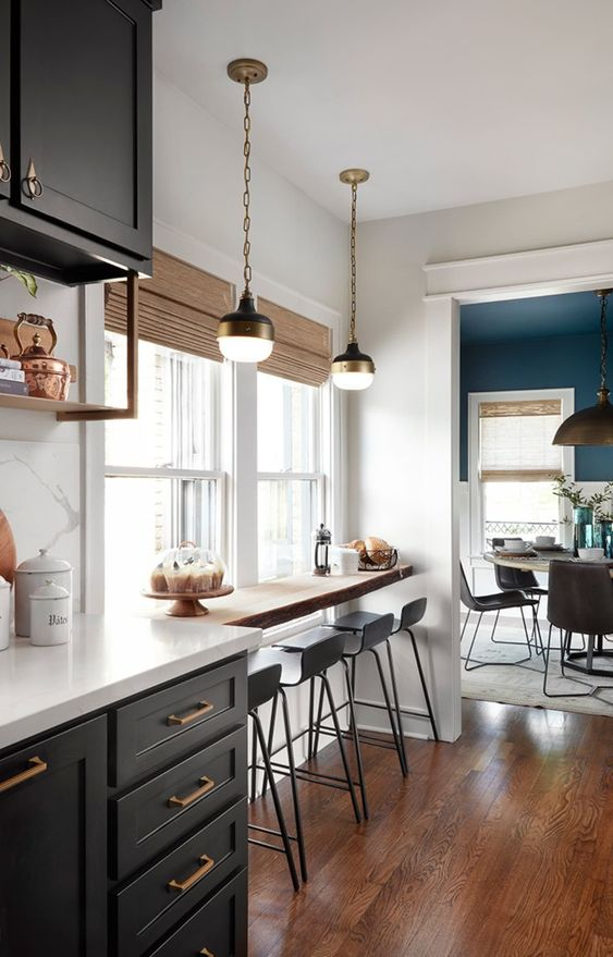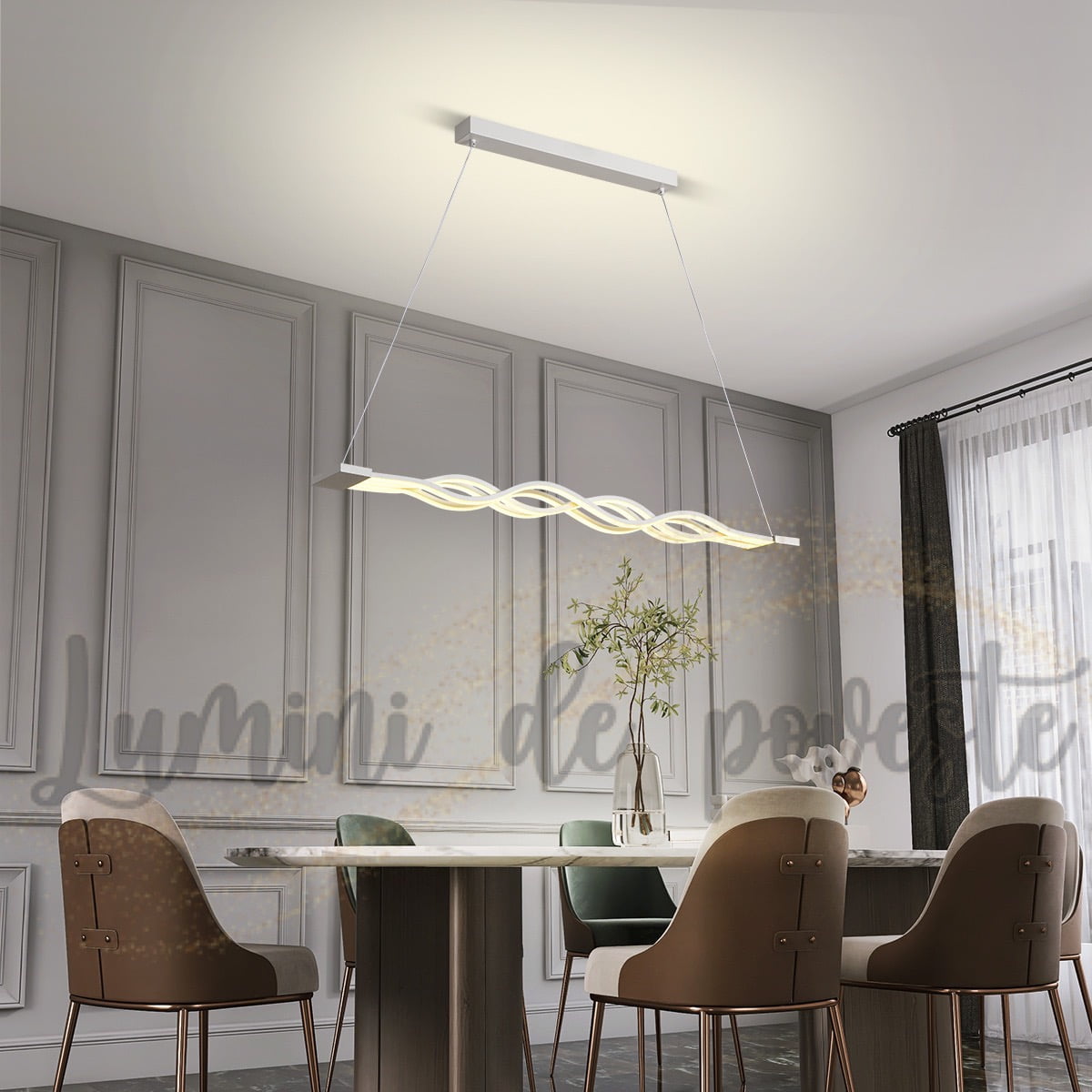 Dacă însă ai destul spațiu, poți renunța de exemplu la plafonieră și să optezi pentru iluminatul blatului și doar un pendul deasupra locului de luat masa.