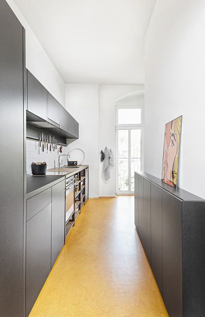O astfel de bucătărie pare cel mai simplu de amenajat pentru că pe un perete așezi cam tot ce ai nevoie: chiuvetă, frigider, aragaz, mașină de spălat. Dacă însă ai loc, poți pune frigiderul pe un alt perete pentru a obține un blat de lucru mai mare. La fel, dacă ai loc pentru o masă așeaz-o pe peretele opus. Dacă spațiul nu e suficient, alege o masă pliabilă.