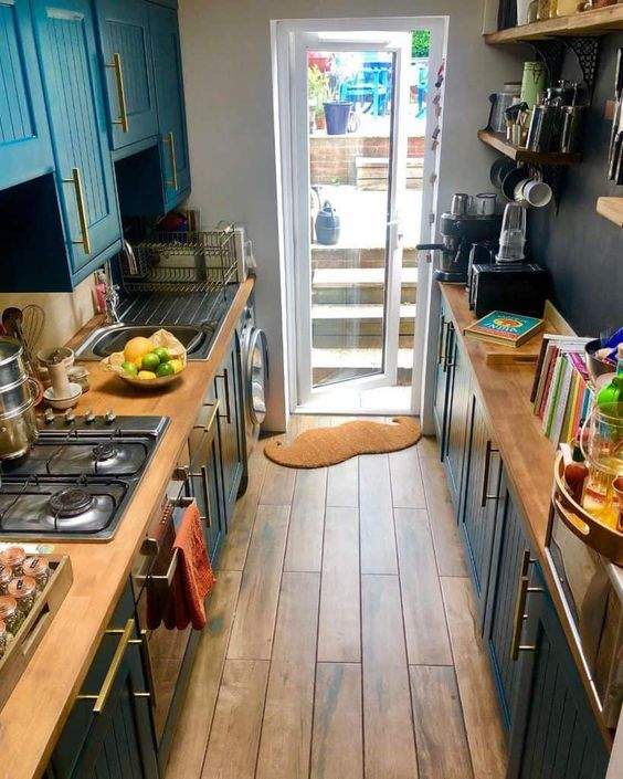 Stilul rustic într-o bucătărie mică și îngustă îi va da și mai mult acel aer de confort și căldură. Folosește culori calde, nuanța lemnului și chiar sticlă. Plantele pe care le poți așeza la o înălțime mai mare vor da un aer boem și vechi. Faianța albă, simplă, va ajuta și ea la acest tip de design, iar un covor lung, în culori de roșu, portocaliu, verde, va completa perfect amenajarea.