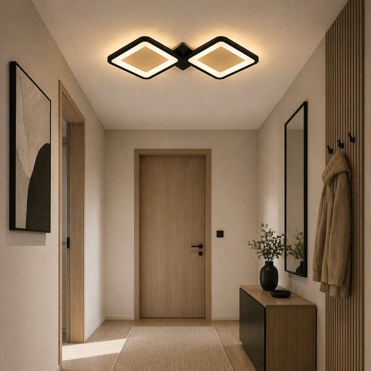 Lustra LED 44 W Ceiling 2 Patrate Negru este alegerea practica pentru cei care doresc un echilibru intre functionalitate si estetica, cu o investitie avantajoasa, mai ales in contextul pretului promotional actual. Este o solutie durabila, eficienta si usor de utilizat, care imbunatateste orice spatiu interior prin iluminarea sa puternica si designul elegant.