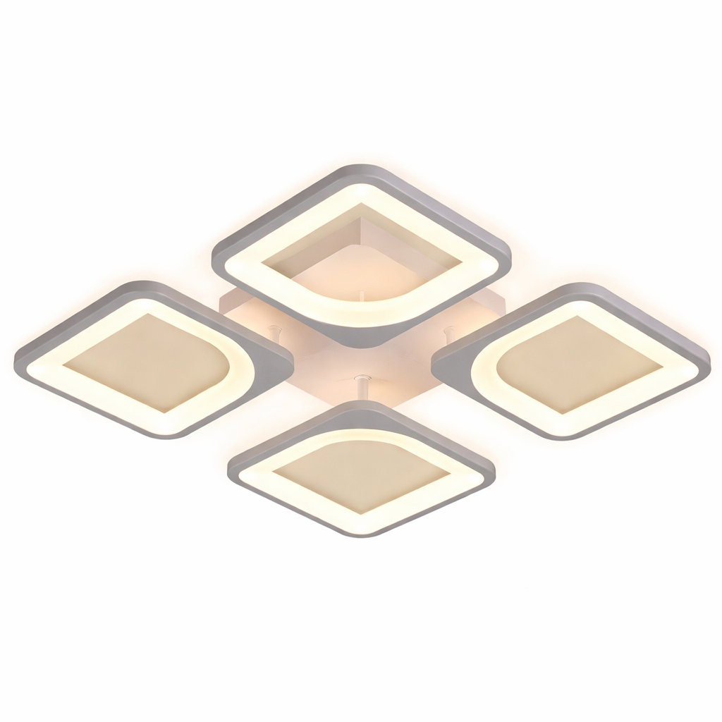 Lustra LED 88 W Ceiling 4 Patrate Mini Alb ofera o solutie eficienta si moderna pentru iluminatul interior, adaptandu-se perfect spatiilor precum dormitorul, holul sau bucataria. Puterea de 88 W si fluxul luminos de 4846 lumeni asigura o iluminare intensa si uniforma, reducand necesitatea utilizarii mai multor corpuri de iluminat.