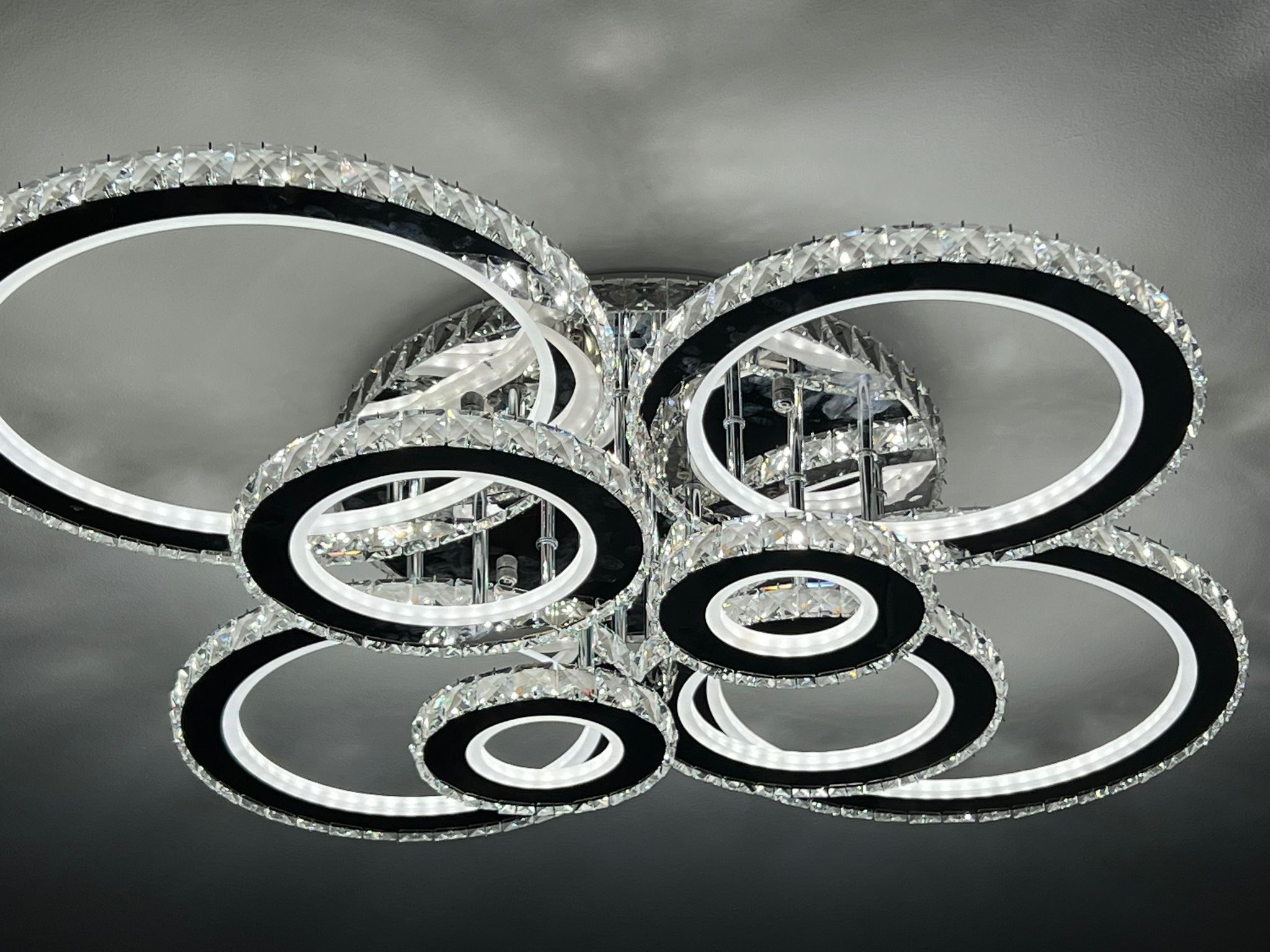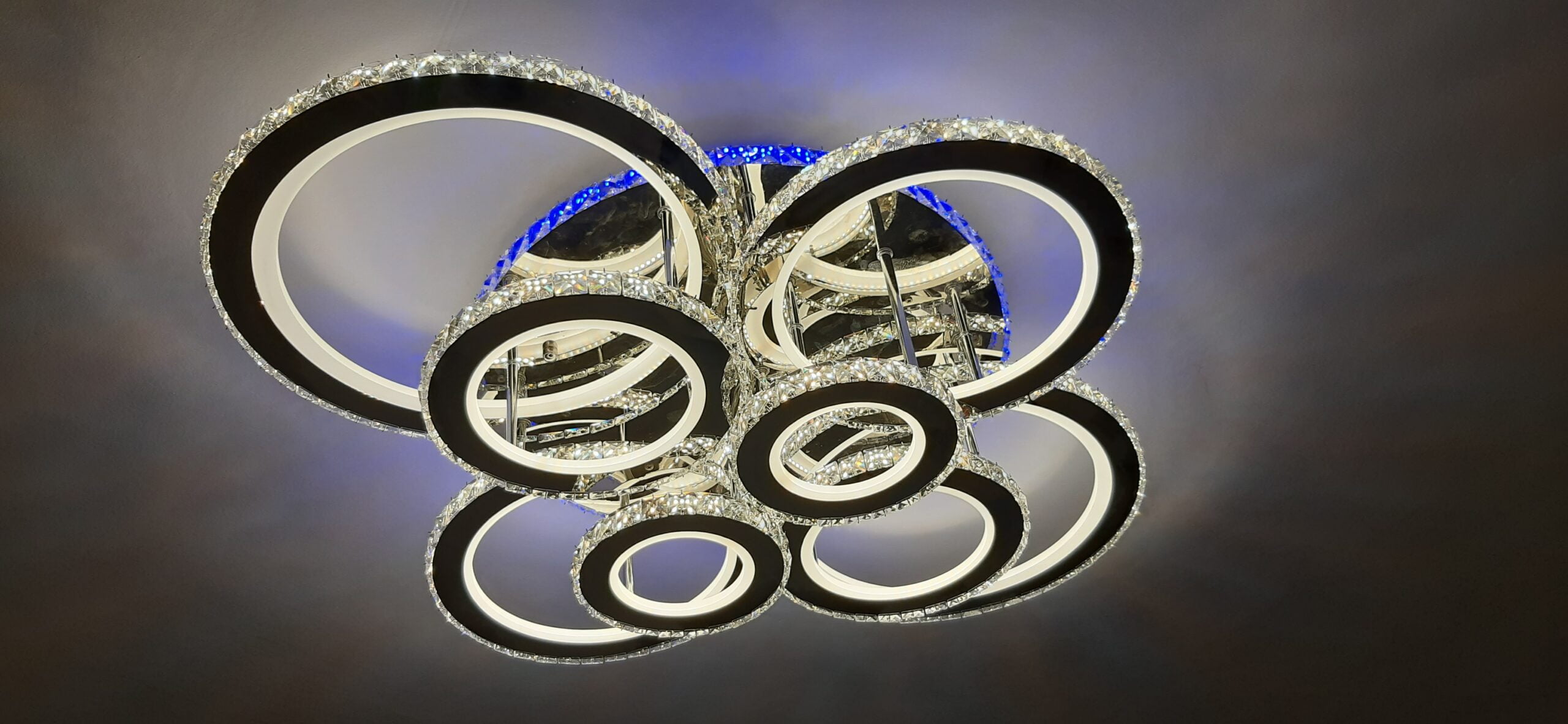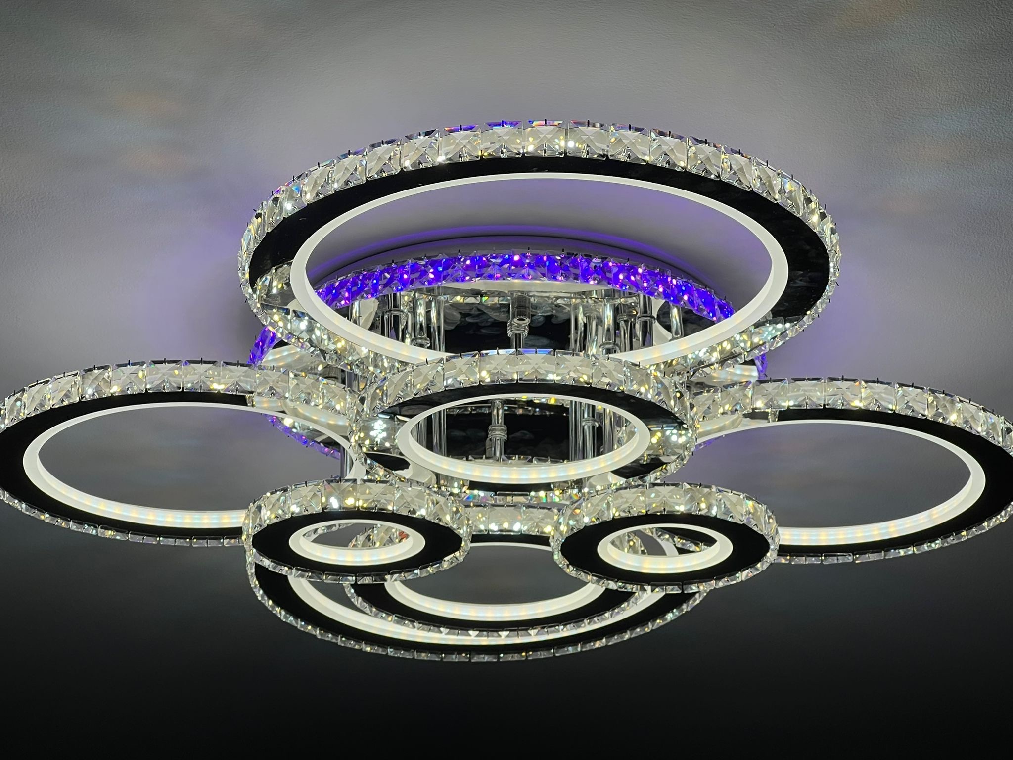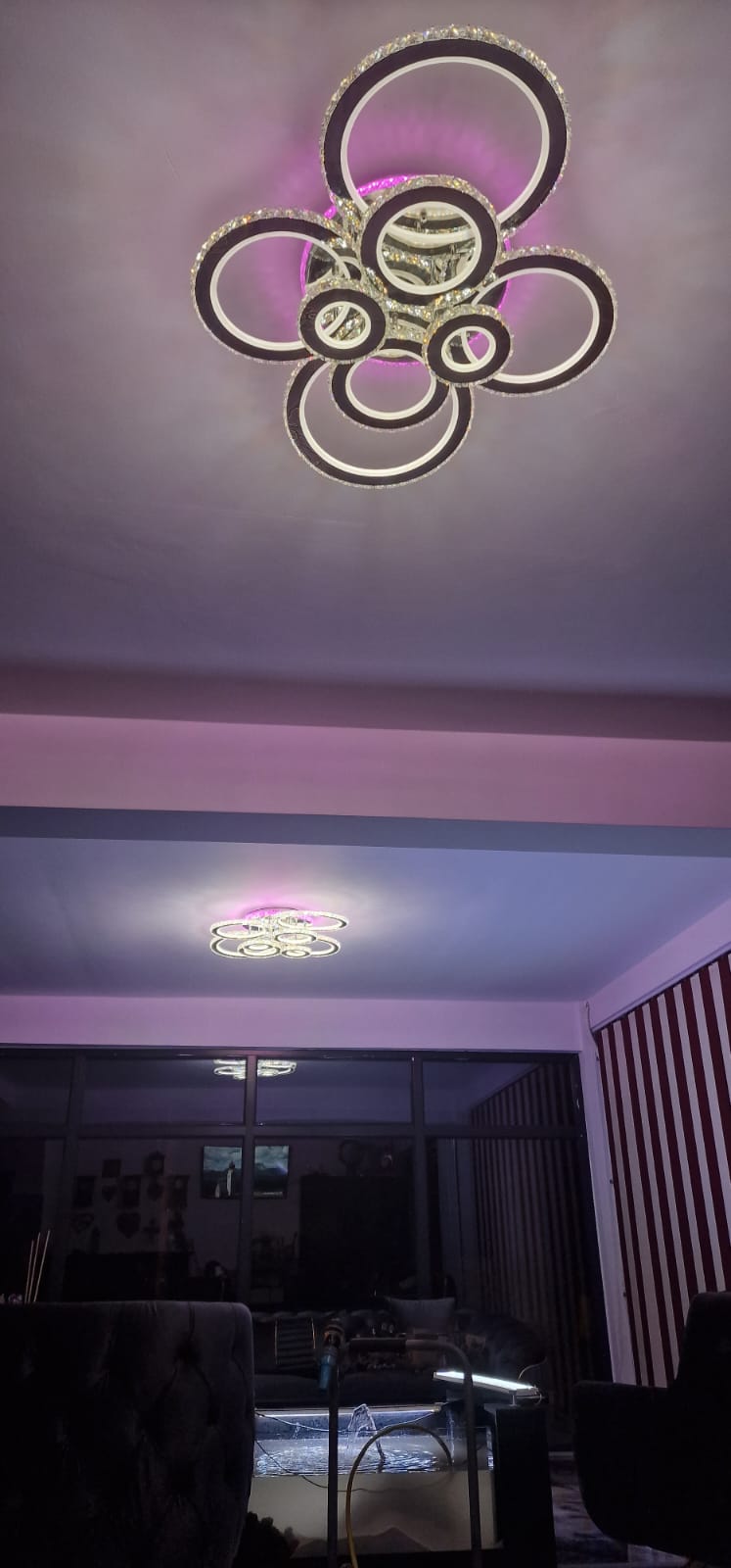Lustra LED 324 W Cristal 8 Cercuri RGB, Telecomanda, reprezinta alegerea ideala pentru cei care doresc un sistem de iluminat modern, eficient si elegant in orice incapere. Aceasta lustra LED se remarca printr-un design sofisticat, compus din opt cercuri din cristal K9 de inalta calitate, montate pe o structura metalica finisata in argintiu si crom, adaptandu-se cu usurinta atat in livinguri, cat si in birouri sau sali de conferinta. Cu o putere impresionanta de 324 W si un flux luminos de 21060 lumeni, Lustra LED 324 W Cristal 8 Cercuri RGB, Telecomanda, ofera o iluminare puternica si uniforma, acoperind suprafete generoase (dimensiuni: latime 70 cm, lungime 90 cm). Integreaza tehnologia LED, ceea ce garanteaza un consum redus de energie si o durata de viata extinsa, sustinuta de garantia de 2 ani si certificatele CE si Ro Hs. Datorita posibilitatii de a regla intensitatea luminii si a schimba temperatura de culoare intre cald, natural, rece sau mod RGB, Lustra LED 324 W Cristal 8 Cercuri RGB, Telecomanda, poate crea atmosfera dorita pentru orice moment al zilei sau pentru orice eveniment special. Controlul se realizeaza simplu, fie printr-un intrerupator clasic, fie prin telecomanda inclusa, oferind un plus de confort si flexibilitate. Un alt avantaj il constituie materialele premium utilizate: cristalul K9 adauga o nota de rafinament si stralucire, iar structura robusta din metal asigura durabilitate in timp. Cu un singur fazaj, instalarea este usoara si sigura. Astfel, Lustra LED 324 W Cristal 8 Cercuri RGB, Telecomanda, imbina perfect estetica, performanta si tehnologia de ultima generatie in iluminatul interior.