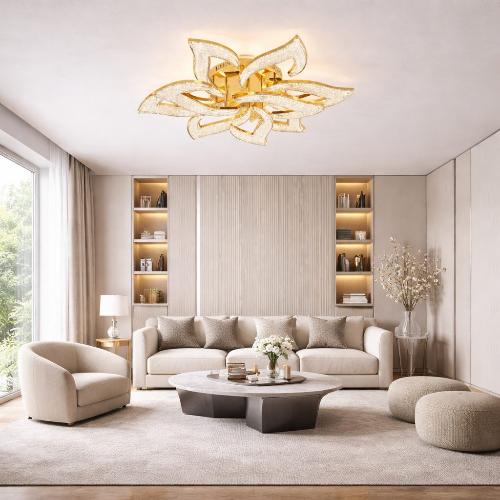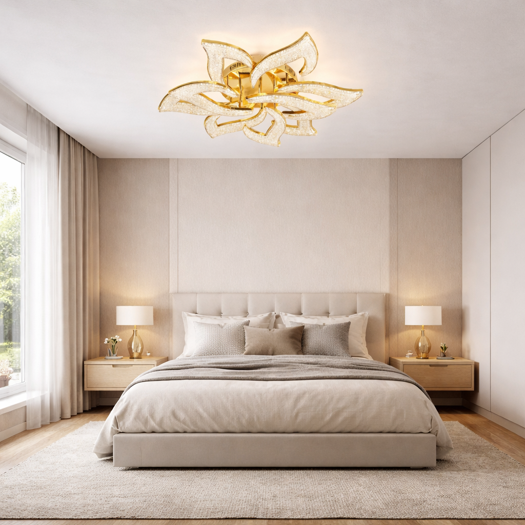 Lustra 200 W Sun Flower Glam Auriu este dotata cu 9 surse de iluminare, ceea ce o face extrem de eficienta si versatila. Interfata de control clasic si telecomanda permit ajustarea intensa a luminii, oferindu-ti posibilitatea de a crea atmosfera perfecta pentru fiecare moment, de la cine romantice la petreceri cu prietenii. Dimabilitatea acestei lustre aduce un plus de confort si personalizare in utilizare, adaptandu-se nevoilor tale.
