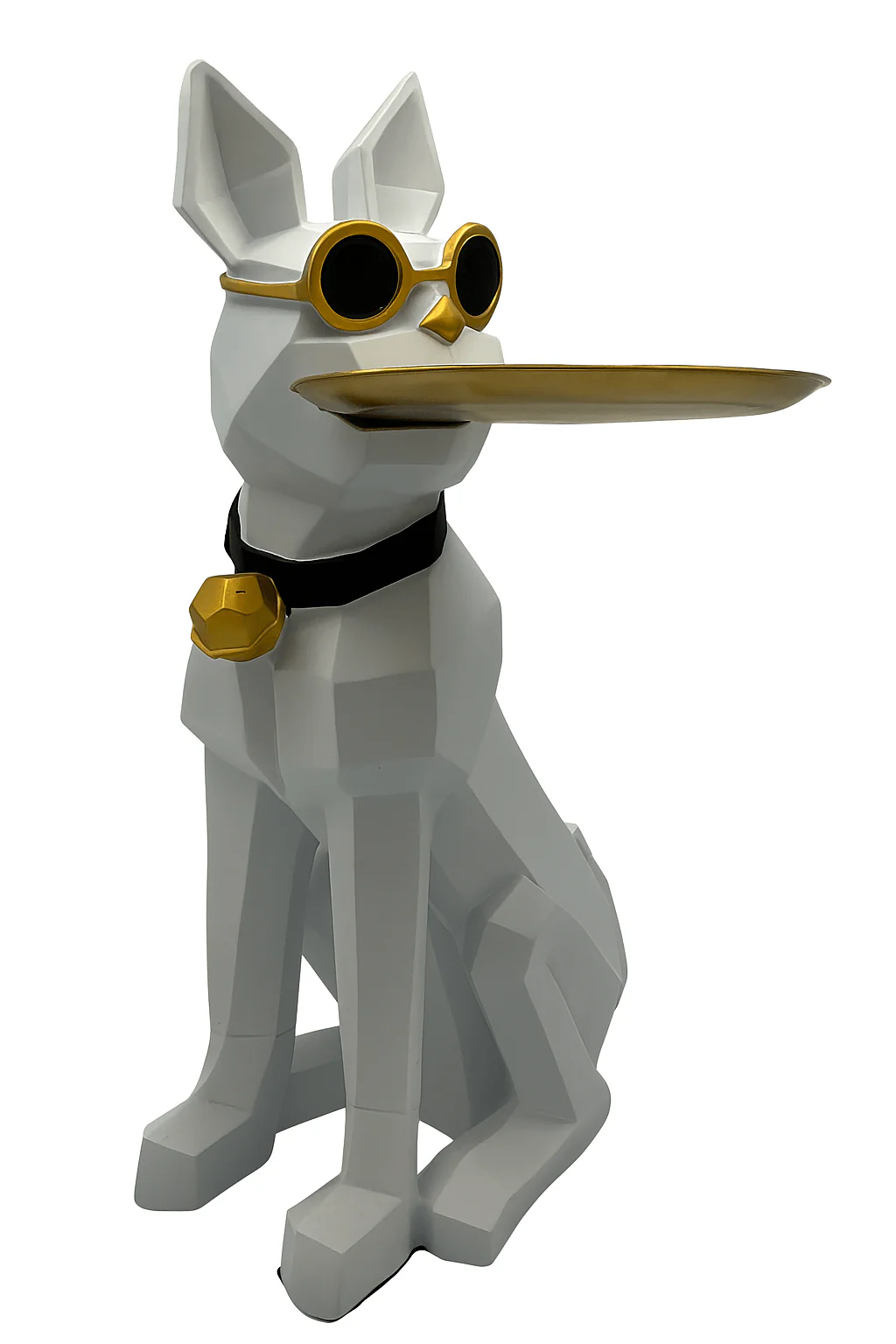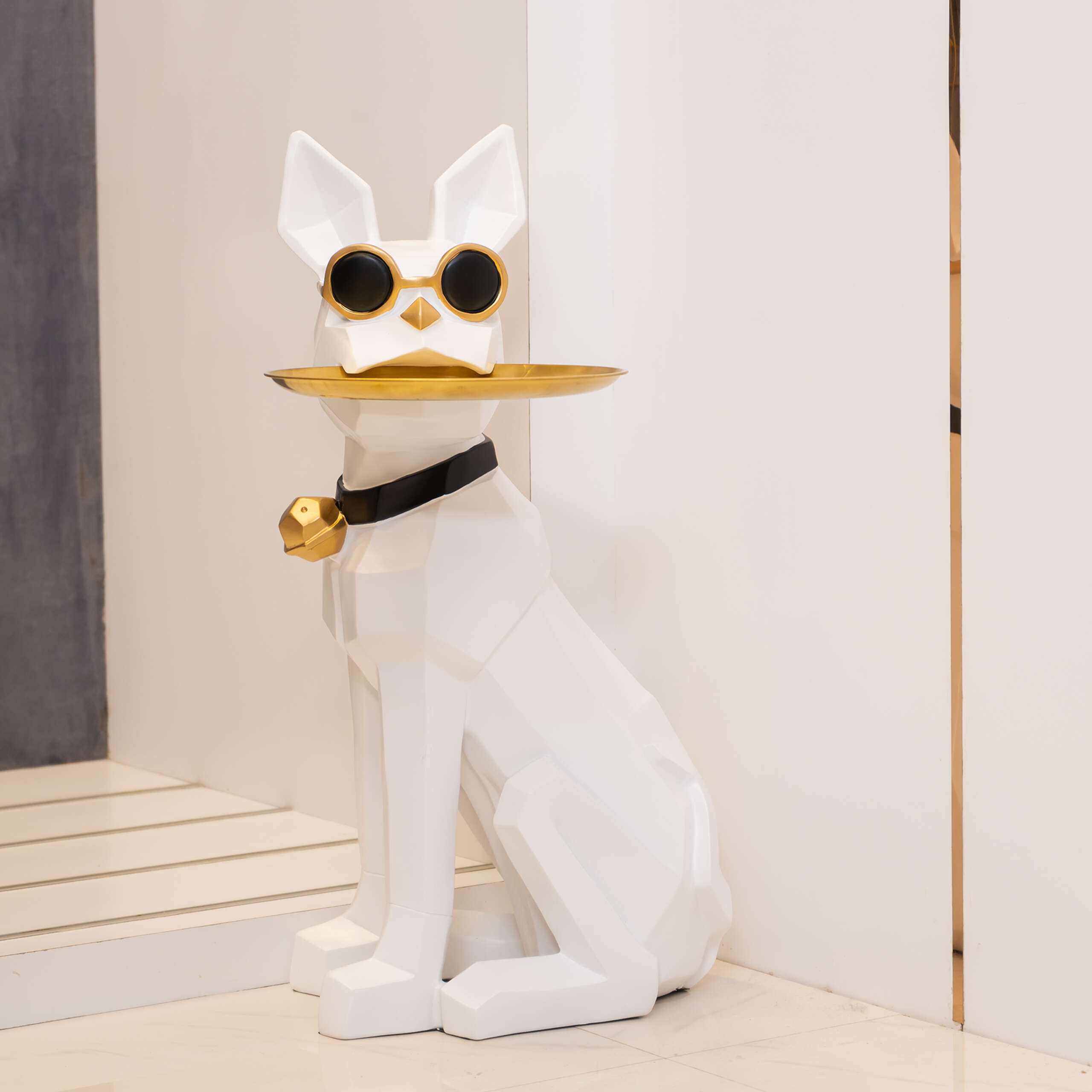 Masuta suport (figurina) Bulldog Alb cu tava aurie reprezinta alegerea ideala pentru cei care doresc sa imbine stilul modern cu functionalitatea intr-un mod inedit. Acest suport decorativ impresioneaza prin designul sau original, fiind realizat sub forma unui bulldog alb cu o tava aurie perfect integrata. Masuta suport (figurina) Bulldog Alb cu tava aurie are o inaltime de 68 cm si o latime de 31 cm, dimensiuni ce o fac potrivita pentru diverse spatii, fie ca este vorba despre sufragerie, hol sau birou.